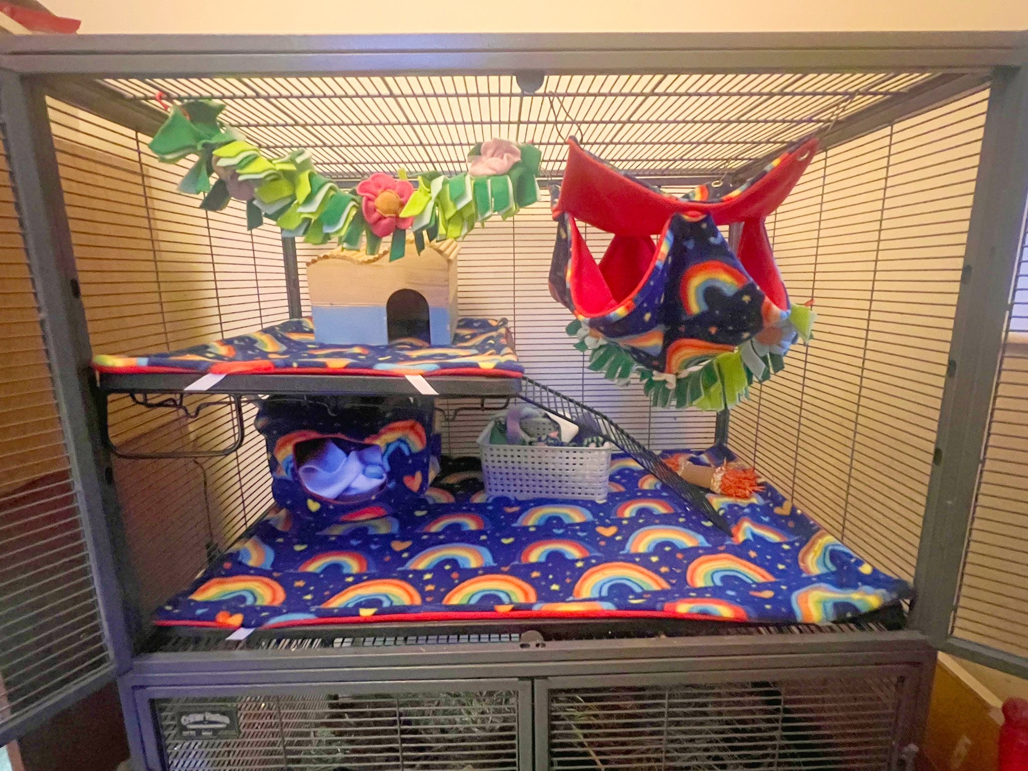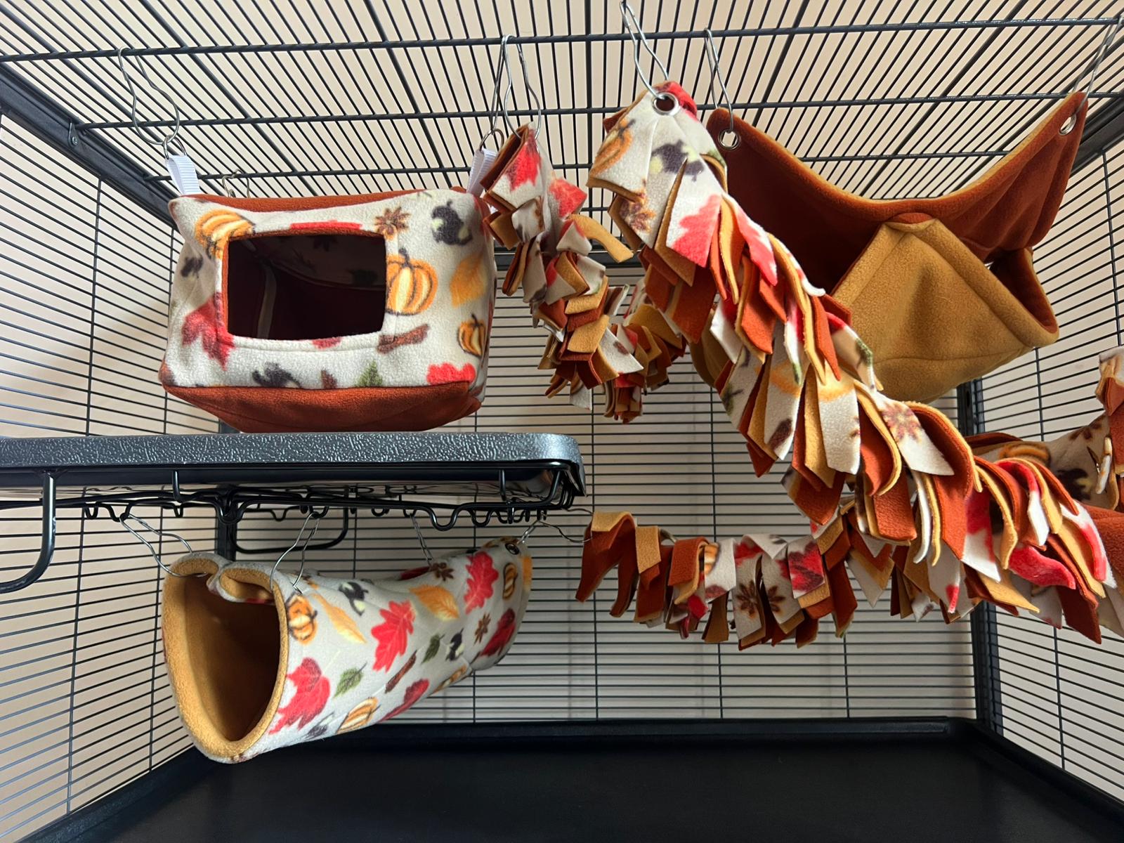 Bumbles cage inspiration gallery shows real setups using my handmade, made-to-order fleece accessories. Every product can be customised in your chosen colours to help you build a cosy and practical home for your small pet.